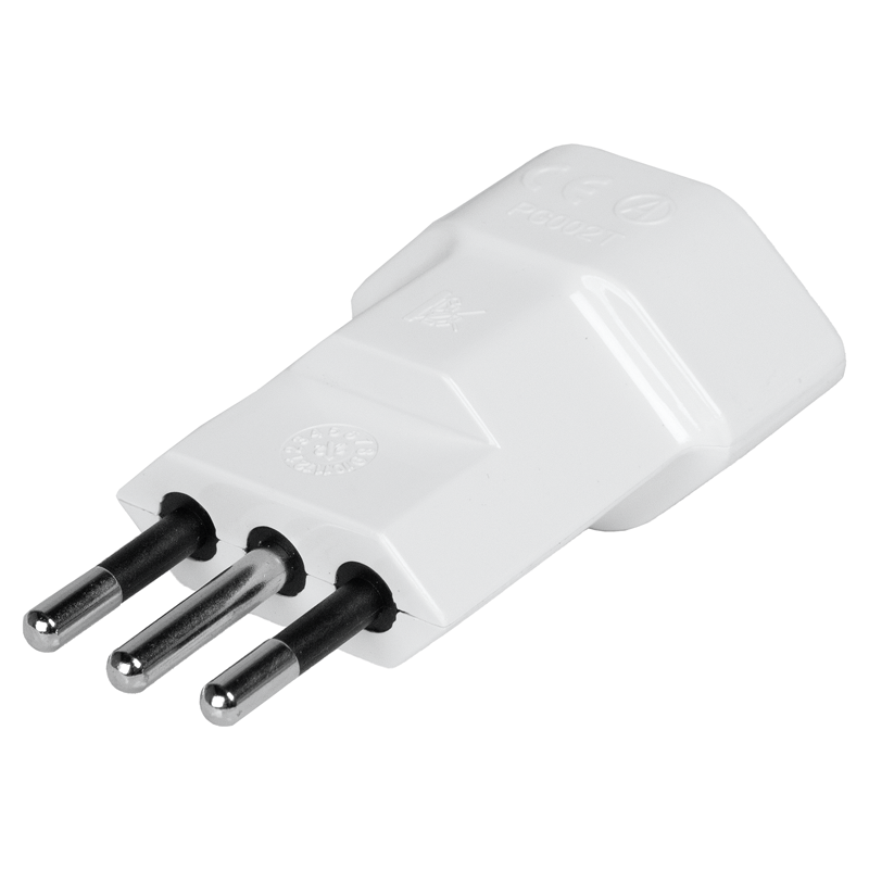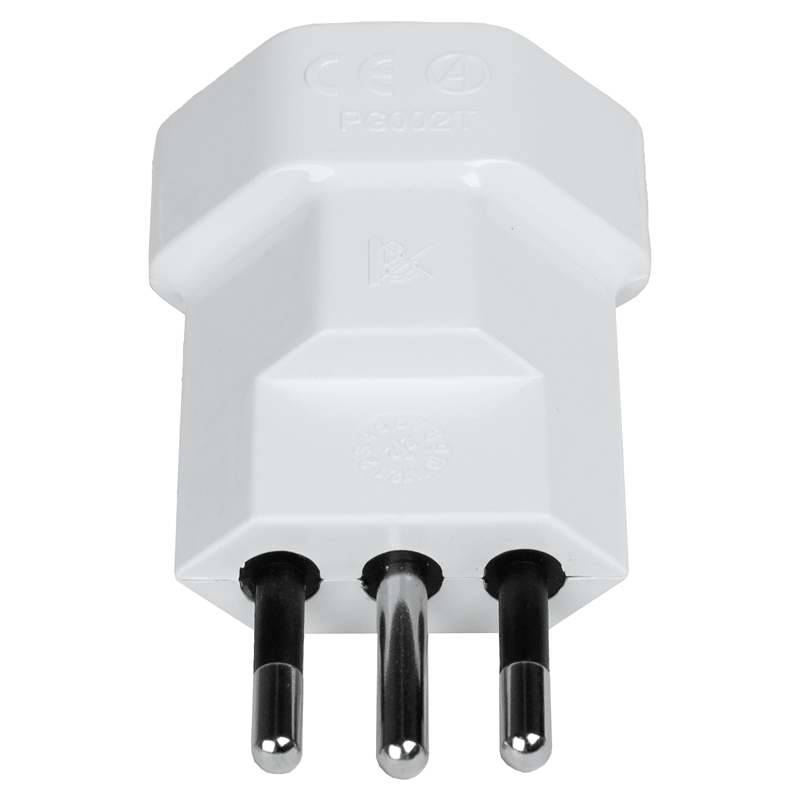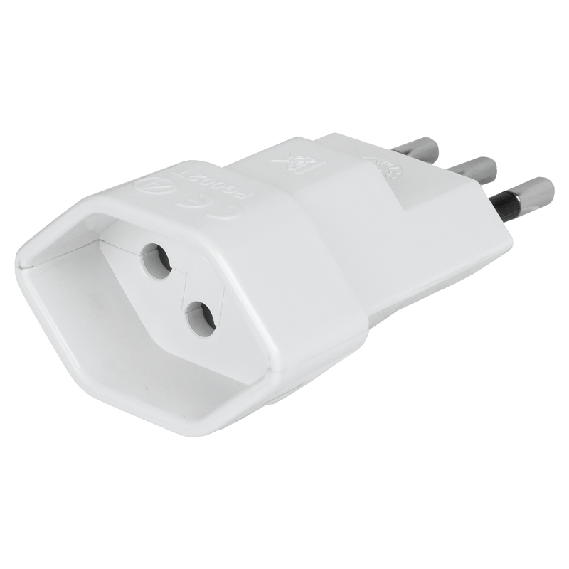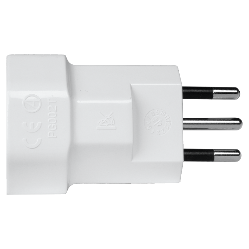 Reiseadapter Schweiz – Italien, 3-polig, Steckdoseneingang für: Schweiz, Ausgangsstecker: Italien, Eingangsspannung: max. 250V, Leistung: max. 2500W, Last: max. 10A, weiss