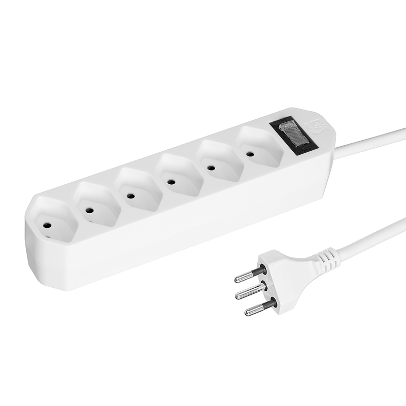 Steckdosenleiste COMPACT 6xT13 längs, Kabel Td H05VV-F 3G1mm2, Kabellänge 1.5m, Stecker T12, Reset-Schalter (EIN-AUS Schalter mit rückstellbarem Überstromschutz), weiss