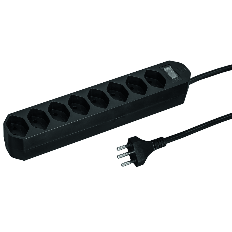 Steckdosenleiste COMPACT 8xT13 längs, Kabel Td H05VV-F 3G1mm2, Kabellänge 1.5m, Stecker T12, Reset-Schalter (EIN-AUS Schalter mit rückstellbarem Überstromschutz), schwarz
