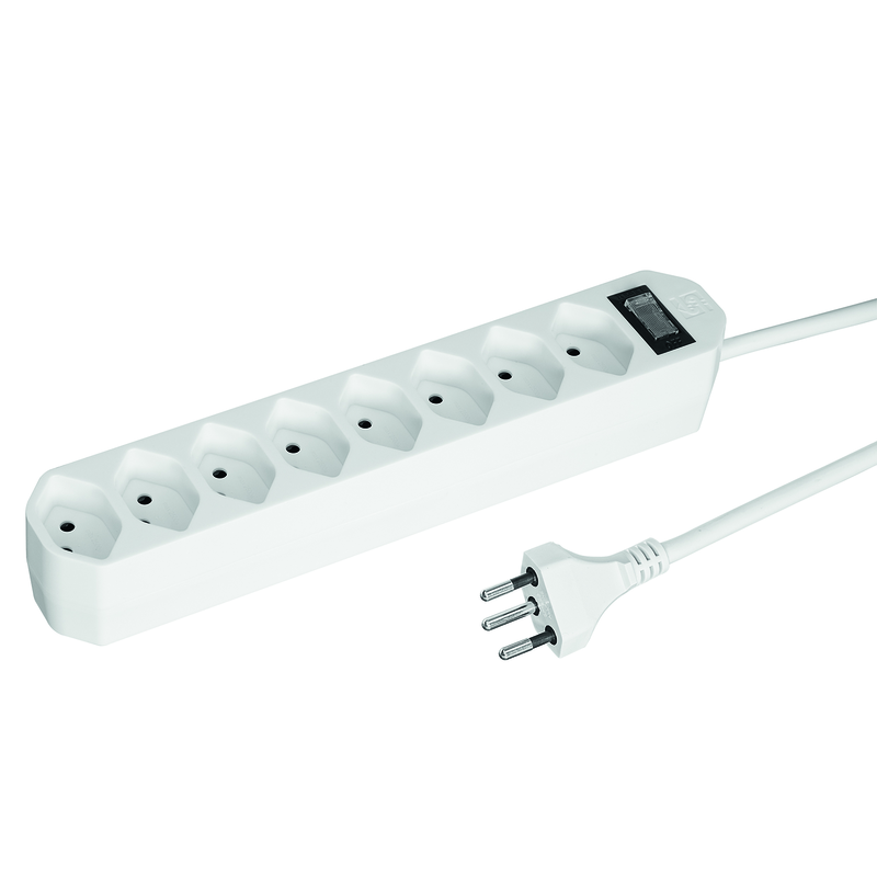 Steckdosenleiste COMPACT 8xT13 längs, Kabel Td H05VV-F 3G1mm2, Kabellänge 1.5m, Stecker T12, Reset-Schalter (EIN-AUS Schalter mit rückstellbarem Überstromschutz), weiss