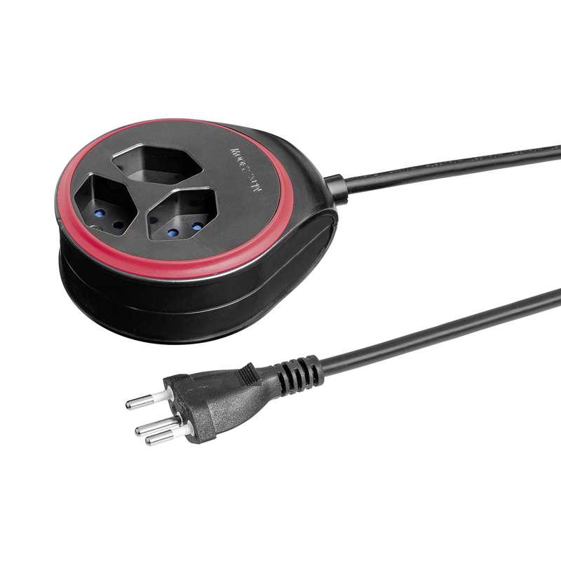 Steckdosenleiste DISC 3xT13 mit erhöhtem Berührungsschutz + 2x USB-A 5V/2.1A, Kabel Td H05VV-F 3G1mm2, Kabellänge 1.5m, Stecker T12, Reset-Schalter (EIN-AUS Schalter mit rückstellbarem Überstromschutz), schwarz/rot