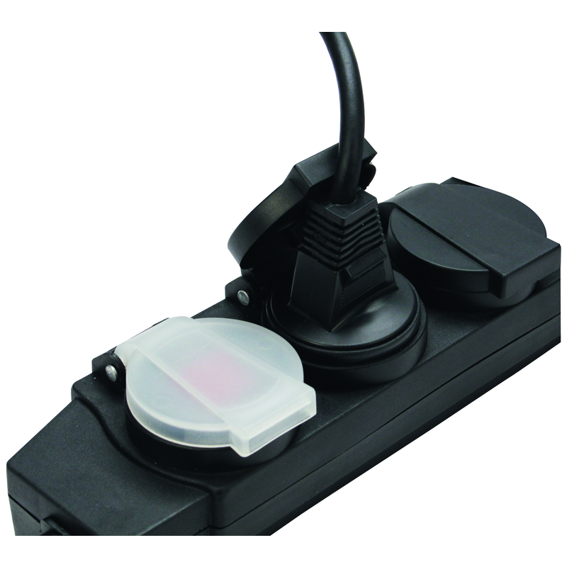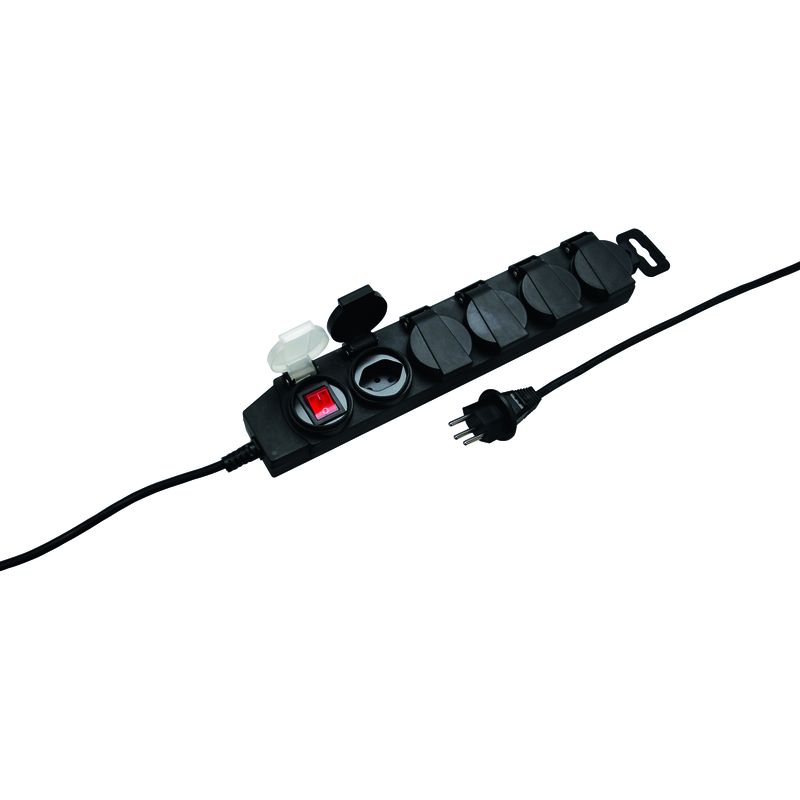 Steckdosenleiste DRY 5xT13 quer, Kabel GdV H05RN-F 3G1mm2 schwarz, Kabellänge 3m, Stecker T12, Reset-Schalter (EIN-AUS Schalter mit rückstellbarem Überstromschutz), Aufhängeöse, IP21, schwarz