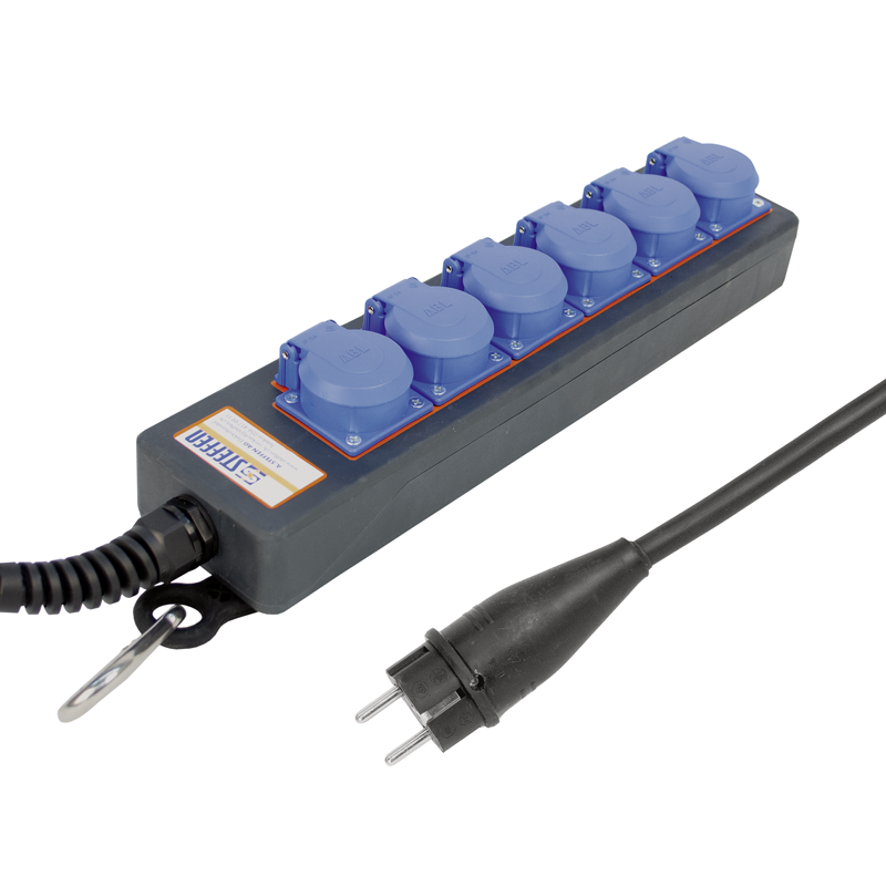 Steckdosenleiste PROFESSIONAL 6xSchuko (Typ F) quer, Kabel GdV H07RN-F 3G2.5mm2 schwarz, Kabellänge 5m, Gummi-Stecker Schuko (Typ E), Karabinerhaken, IP54, schwarz/blau