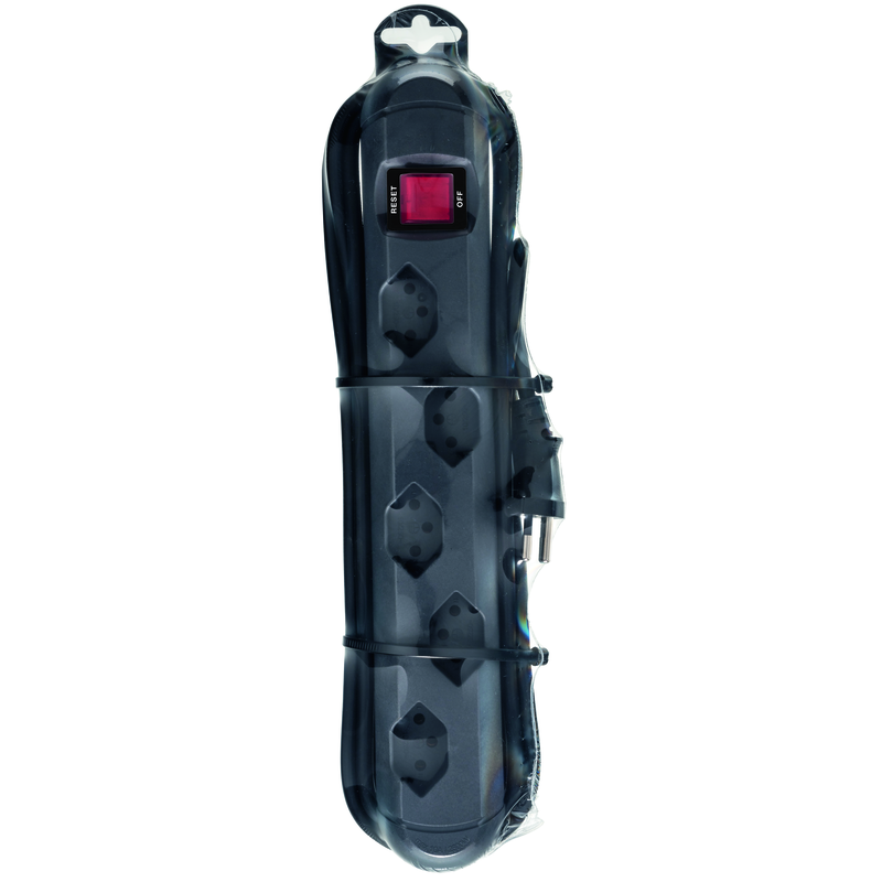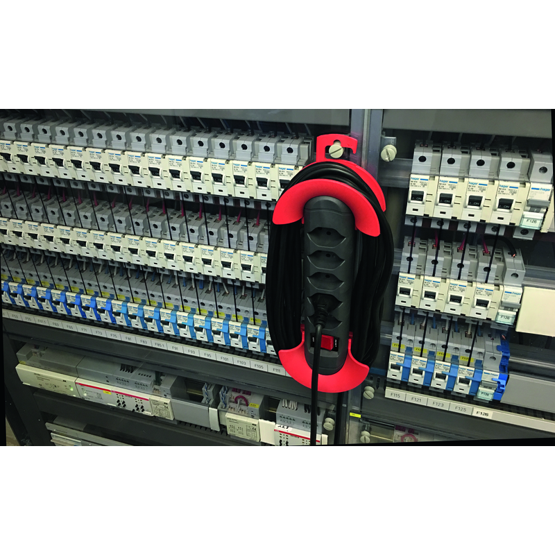 Steckdosenleiste STRONG 5xT13 quer, Kabel Td H05VV-F 3G1mm2, Kabellänge 3m, Stecker T12, Reset-Schalter (EIN-AUS Schalter mit rückstellbarem Überstromschutz), Haftmagnete inkl. Mangetklebehalterungen, Aufwickelvorrichtung, schwarz