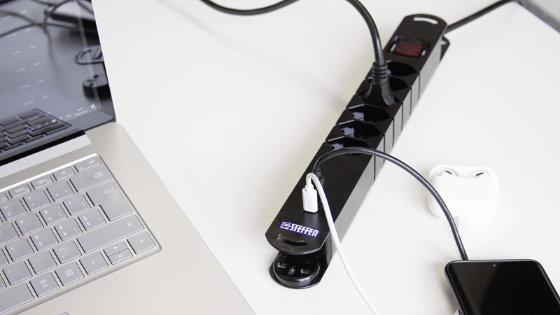 Steckdosenleiste VARIABL 6xT13 längs mit erhöhtem Berührungsschutz + 2xUSB-C PD 18W (Total 36W), Kabel Td H05VV-F 3G1mm2, Kabellänge 3m, Stecker T12, Reset-Schalter (EIN-AUS Schalter mit integriertem Überstromschutz), Aufhängeösen, Haftmagnete inkl. Mangetklebehalterungen, Aufwickelvorrichtung, schwarz. Power Delivery, oder kurz PD, ist eine Technologie für schnelles, intelligentes Aufladen. Der PD Standard ermöglicht ein bis zu 3x schnelleres Laden als ein herkömmliches USB Ladegerät.