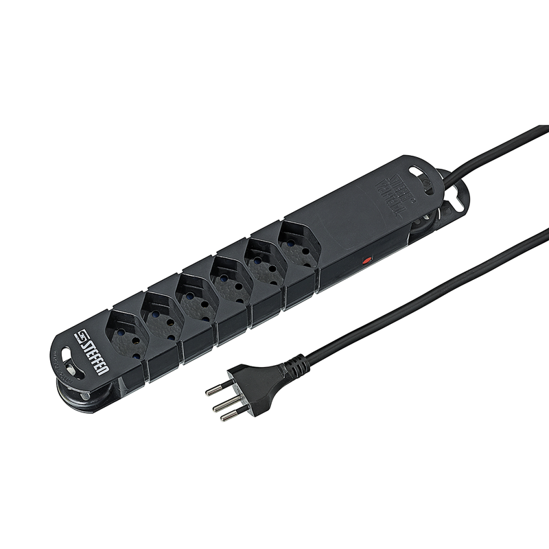 Steckdosenleiste VARIABL 6xT13 längs mit erhöhtem Berührungsschutz, Kabel Td H05VV-F 3G1mm2, Kabellänge 5m, Stecker T12, Reset-Knopf (rückstellbarer Überstromschutz), Aufhängeösen, Haftmagnete inkl. Mangetklebehalterungen, Aufwickelvorrichtung, schwarz
