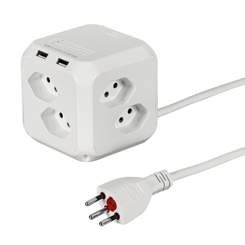 Steckdosenwürfel CUBE 8xT13 längs mit erhöhtem Berührungsschutz + 2x USB-A 5V/2.4A, Kabel Td H05VV-F 3G1mm2, Kabellänge 1.5m, Stecker T12 mit integrierter Feinsicherung (T10A/250V), inkl. doppelseitigem Klebeband und Antirutsch-Pad, weiss