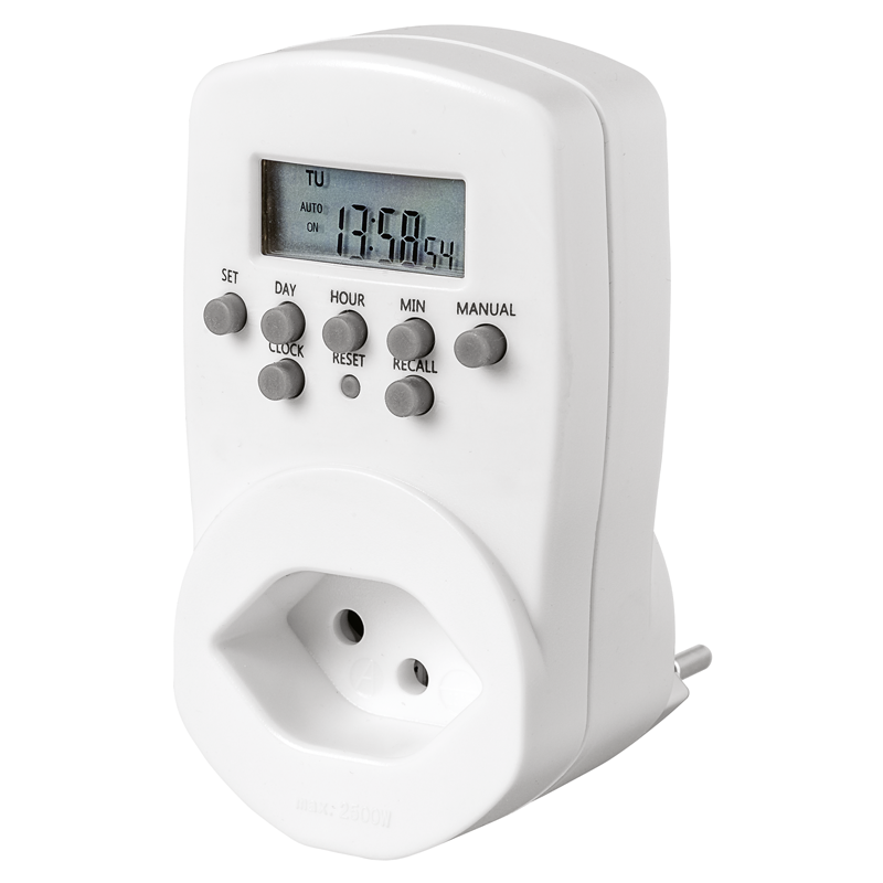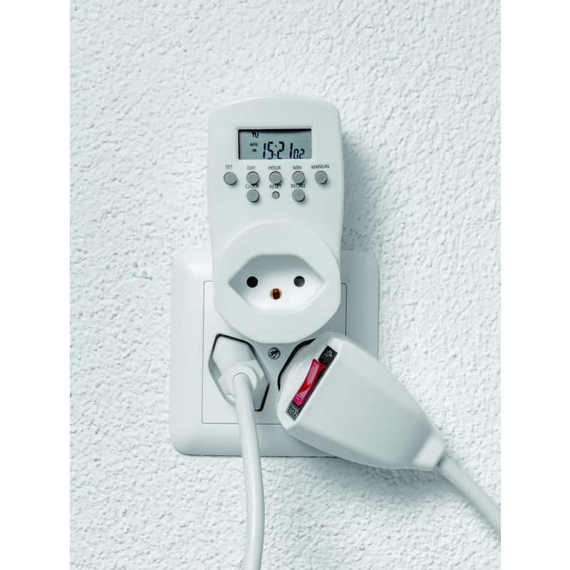 Timer digital (Stecker Typ 12 dezentral angeordnet / Steckdose Typ 13 mit erhöhtem Berührungsschutz) mit 20 Schaltprogrammen in einem 24h-Zyklus, inkl. Zufallsgenerator und Countdown-Funktion, weiss