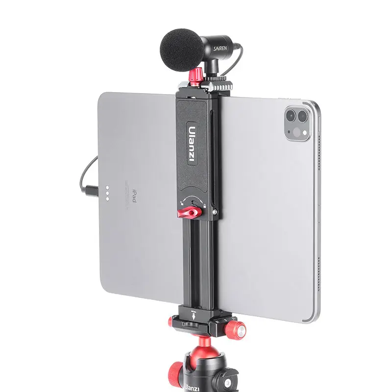 Mit dem verstellbaren Tablet-Halter Ulanzi U-Pad III können Sie Ihr iPad oder ein anderes Tablet präzise und fest auf einem Stativ befestigen. Alle Tablets mit einer Breite von bis zu 23 cm passen in den Halter, selbst das grösste iPad Pro. Sie möchten bei Ihren Aufnahmen besseren Ton oder besseres Licht? Kein Problem. Die Blitzschuhhalterung an der Oberseite passt für ein Videolicht, ein Mikrofon oder anderes Zubehör mit Blitzschuhanschluss. Befestigen Sie Ihr Tablet einfach auf einem Stativ mit der universellen 1/4-Zoll-Schraubverbindung an der Unterseite des Tablet-Halters. Sowohl die Unterseite als auch die gesamte Länge der Halterung fungieren auch als Acra Swiss Quick Release-Stativplatte (für Arca-Swiss-Stative). Der Halter ist für Tablets mit einer Breite von bis zu 23 Zentimetern ausgelegt, eignet sich aber auch für die vertikale Montage eines Smartphones (mindestens 10 Zentimeter hoch).