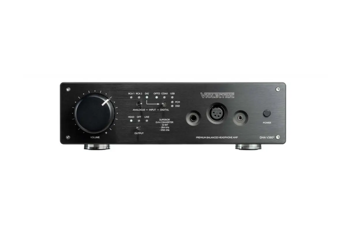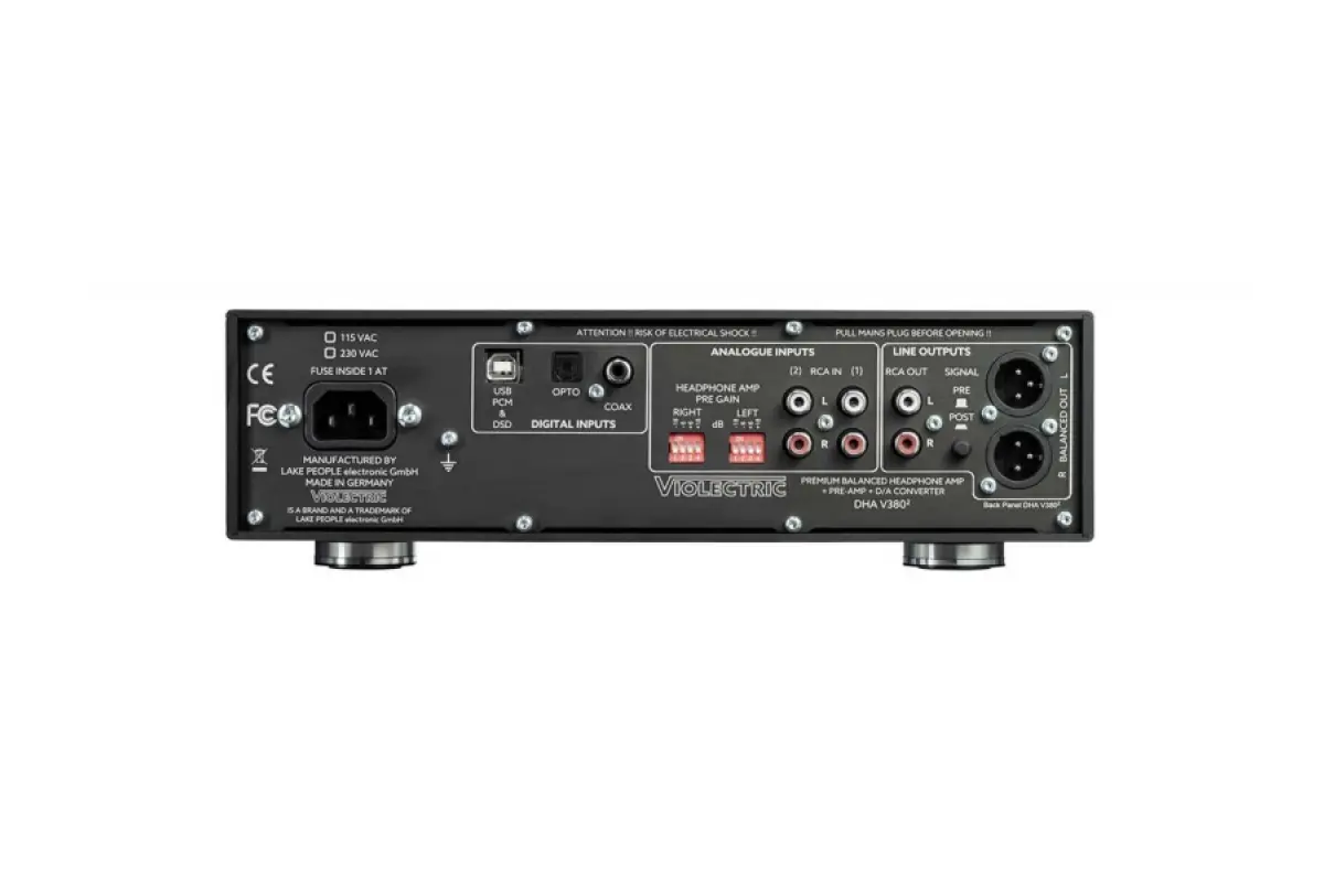 Der DHA V380² ist ein neuer Spitzen-Kopfhörerverstärker mit State-of-the-Art D/A Wandler im Violectric Programm. Der D/A Wandler ist eine Neuentwicklung und beinhaltet einen 32-Bit Resampler / Reclocker und zwei 32 Bit D/A Wandler pro Kanal. Im Kopfhörerverstärker wurden die neuesten Erkenntnisse der vielfachen Testsieger von Lake People, Violectric und Niimbus umgesetzt. Der DHA V380 bietet durch seine unvergleichliche Technologie nicht nur einen der leistungsfähigsten Kopfhörerverstärker im Markt, sondern auch geringstes Rauschen durch eine sehr kleine interne Verstärkung. Dadurch ist das Eigenrauschen der Verstärker unhörbar. Hohe Ausgangsspannung durch 50 Volt interne Betriebsspannung. Deshalb bestens geeignet für hochohmige Kopfhörer. Hohe Ausgangsleistung durch kraftvolle Verstärker, die weit mehr Leistung liefern können als auch der anspruchsvollste Kopfhörer brauchen kann. Deshalb bestens geeignet für Kopfhörer mit niedrigen Impedanzen und auch Magnetostaten. Hoher Dämpfungsfaktor durch niedrigste Ausgangsimpedanz. Daher bestens geeignet, um auch schwierigste Kopfhörer störungsfrei auszutreiben, mit Garantie auf kompromisslosen Frequenzgang. Sie haben die Wahl, Kopfhörerverstärker, Vorverstärker oder Beides ? Die Kopfhörerausgänge oder die rückwärtigen Line-Ausgänge können per Schalter auf der Front de/aktiviert werden. Verbinde nicht nur deine Kopfhörer mit dem DHA V380, sondern auch deinen Endverstärker oder deine aktiven Lautsprecher und geniesse einen kompakten und fantastisch klingenden Kopfhörerverstärker mit einem State-of-the-Art D/A Wandler und einem Premium Vorverstärker. 2 analoge Stereoeingange, unsymmetrisch über Cinch, 3 digitale Eingänge, Opto, Coax mit 24 Bit und 96/192kHz, USB mit bis zu 32 Bit und bis 384kHz für PCM Signale, DSD 64 – 256, 32 Bit Resampling / Reclocking mit 180dB Dynamik, schaltbar On / Off / Best, 2x 32 Bit Wandler pro Kanal mit -112dB THD+N und 123dB Dynamik, +/- 18 dB Pre-Gain zur optimalen Anpassung des DHA V380 an Quelle und Kopfhörer, Lautstärkeregelung mit RK27 Poti, 4 leistungsfähige Verstärker, 5000 mW Pmax an 50 Ohm, 21V RMS an 600 Ohm, verzögerte Zuschaltung der Kopfhörer nach Power-On, Kopfhörerweg und Line-Out Weg getrennt wählbar, 1 symmetrischer Kopfhörerausgang mit 4-pol XLR, 2 unsymmetrische Ausgänge mit 6,3 mm Klinke, Line Out, 1x symmetrisch über XLR und 1x unsymmetrisch über Cinch, Ringkern Transformator, > 26.500 uF Siebkapazität.