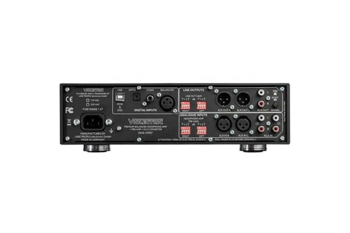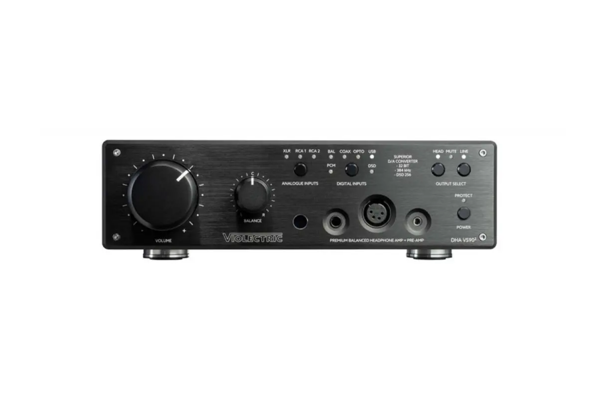 State-of-the-Art D/A Wandler, Vorverstärker & Kopfhörerverstärker mit 256 Step Relais. Der Violectric V590² PRO ist das neue Spitzengerät im Violectric Programm. Er verfügt über einen State-of-the-Art D/A Wandler und einen ebensolchen Kopfhörerverstärker. Der D/A Wandler ist eine Neuentwicklung mit dem ESS-Tech ES9026 PRO Konverter. Dieser 32-Bit Wandler beinhaltet 4 parallele D/A Wandler pro Kanal und bietet einen Dynamikumfang von 124dB bei einem THD+N von -110dB. Im Kopfhörerverstärker wurden die neuesten Erkenntnisse der vielfachen Testsieger von Violectric und Niimbus umgesetzt. Die meisten Funktionen können komfortabel über eine Fernbedienung gesteuert werden. Der Violectric DHA V590 II bietet durch seine unvergleichliche Technologie nicht nur einen der leistungsfähigsten Kopfhörerverstärker im Markt, sondern auch geringstes Rauschen durch eine sehr kleine interne Verstärkung. Dadurch ist das Eigenrauschen der Verstärker unhörbar. Hohe Ausgangsspannung durch 50 Volt interne Betriebsspannung. Deshalb bestens geeignet für hochohmige Kopfhörer. Hohe Ausgangsleistung durch kraftvolle Verstärker, die weit mehr Leistung liefern können als auch der anspruchsvollste Kopfhörer brauchen kann. Deshalb bestens geeignet für Kopfhörer mit niedrigen Impedanzen und auch Magnetostaten. Hoher Dämpfungsfaktur durch niedrigste Ausgangsimpedanz. Daher bestens geeignet, um auch schwierigste Kopfhörer störungsfrei auszutreiben, mit Garantie auf kompromisslosen Frequenzgang.