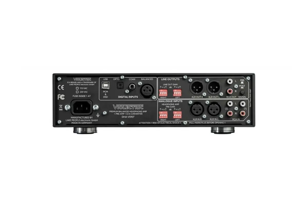 State-of-the-Art D/A Wandler, Vorverstärker & Kopfhörerverstärker. Der Violectric V590² ist das neue Spitzengerät im Violectric Programm. Er verfügt über einen State-of-the-Art D/A Wandler und einen ebensolchen Kopfhörerverstärker. Der D/A Wandler ist eine Neuentwicklung mit dem ESS-Tech ES9026 PRO Konverter. Dieser 32-Bit Wandler beinhaltet 4 parallele D/A Wandler pro Kanal und bietet einen Dynamikumfang von 124dB bei einem THD+N von -110dB. Im Kopfhörerverstärker wurden die neuesten Erkenntnisse der vielfachen Testsieger von Violectric und Niimbus umgesetzt. Die meisten Funktionen können komfortabel über eine Fernbedienung gesteuert werden. Der Violectric DHA V590 II bietet durch seine unvergleichliche Technologie nicht nur einen der leistungsfähigsten Kopfhörerverstärker im Markt, sondern auch geringstes Rauschen durch eine sehr kleine interne Verstärkung. Dadurch ist das Eigenrauschen der Verstärker unhörbar. Hohe Ausgangsspannung durch 50 Volt interne Betriebsspannung. Deshalb bestens geeignet für hochohmige Kopfhörer. Hohe Ausgangsleistung durch kraftvolle Verstärker, die weit mehr Leistung liefern können als auch der anspruchsvollste Kopfhörer brauchen kann. Deshalb bestens geeignet für Kopfhörer mit niedrigen Impedanzen und auch Magnetostaten. Hoher Dämpfungsfaktur durch niedrigste Ausgangsimpedanz. Daher bestens geeignet, um auch schwierigste Kopfhörer störungsfrei auszutreiben, mit Garantie auf kompromisslosen Frequenzgang.