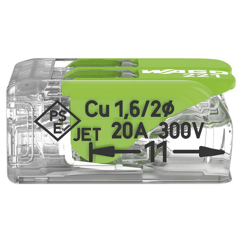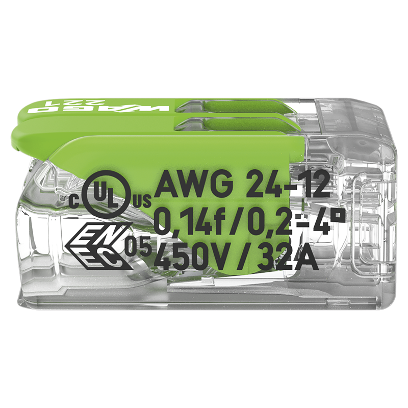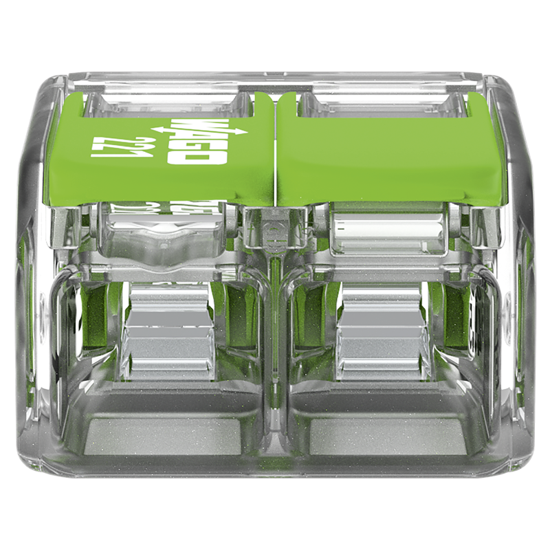 WAGO Steckklemme COMPACT Green Range 2x 0.14-4mm², mit Betätigungshebel, für alle Leiterarten, transparent/grün, Pack à 100 Stk.