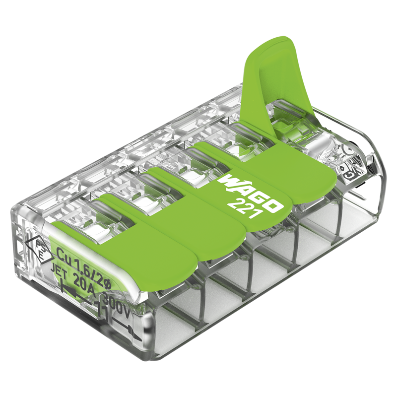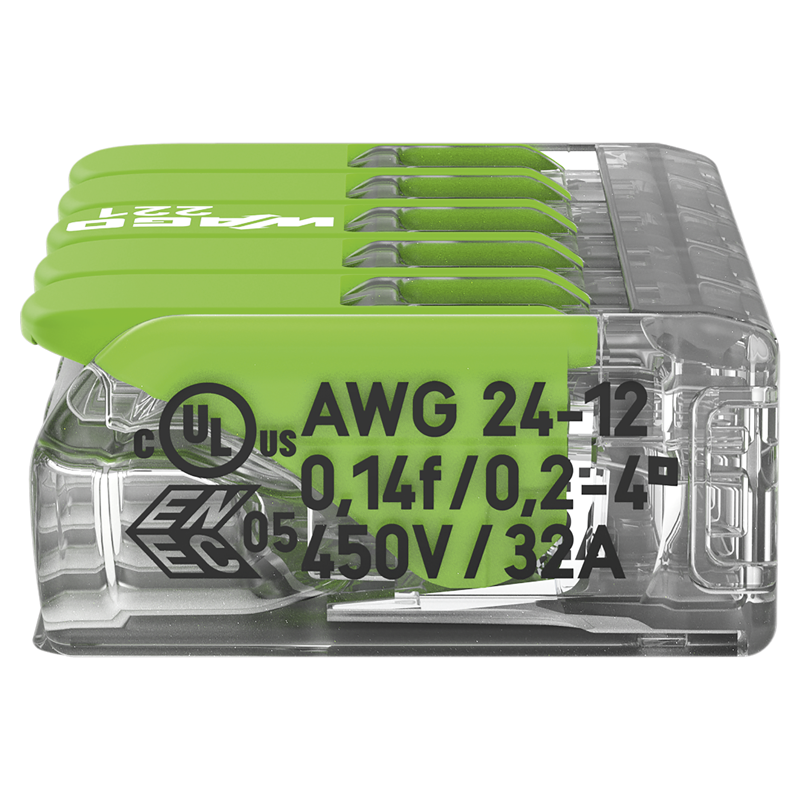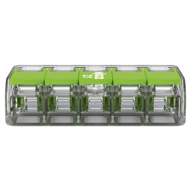 WAGO Steckklemme COMPACT Green Range 5x 0.14-4mm², mit Betätigungshebel, für alle Leiterarten, transparent/grün, Pack à 25 Stk.