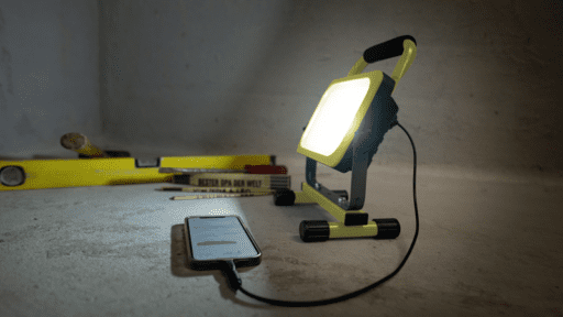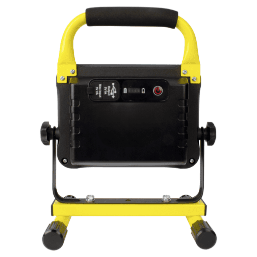 WORKLIGHT LED Akku-Strahler 30W, 3300lm, 6500K, gelb, mit Traggriff schwarz, IP54, Lithium Batterie 3.7V/10000mAh und 0.6m USB-C Ladekabel, dimmbar mit 3 Helligkeitsstufen (100%, 50% und 25%), Aufladezeit 5-6 Stunden, Laufzeit 3 Stunden bei 100%
